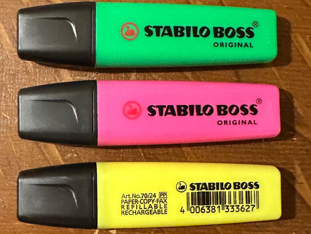 Emphasize it with highlighters from Stabilo. First introduced in 1971, these long-lasting text markers come in a variety of colors, feel great in the hand, and add a splash of color to your workplace as well as your journal entries or memoranda.