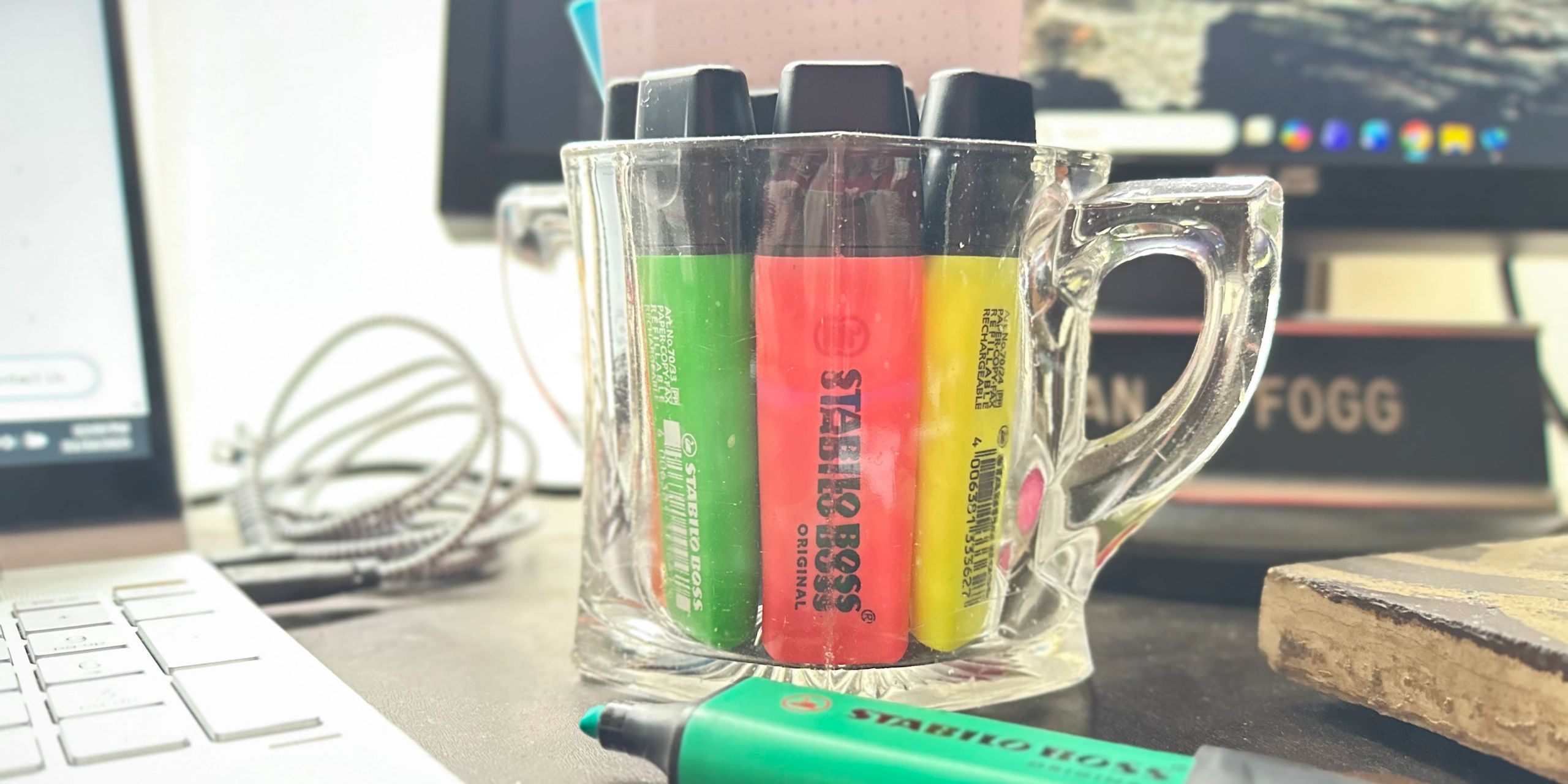 Text highlighters from Stabilo. First introduced in 1971, these handsome and long-lasting text markers come in a variety of colors, feel great in the hand, and add a splash of color to your workplace as well as in your journal entries and memoranda. They're also a great tool to organize your thoughts!